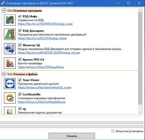 Для автоматического скачивания всех перечисленных программ можно воспользоваться утилитой: https://4mixa.ru/files/butakovDownloader.exe . После запуска этой утилиты и нажатия кнопки скачать создастся папка «DECL_APP» и в нее сохранятся необходимые программы.