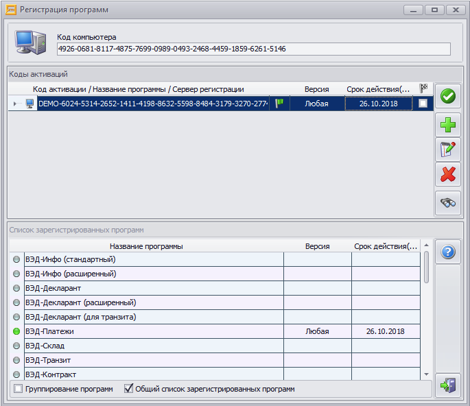 5. После этого произойдет обращение к серверу ООО «СТМ». Если регистрация прошла успешно, то появится окно регистрации программ, в котором будет отображаться полученный «ознакомительный» код активации (такой код имеет приставку DEMO).