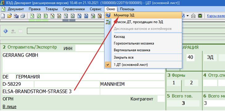 1. Запустить программу ВЭД-Декларант. 2. Зайти в меню Окно->Монитор ЭД
