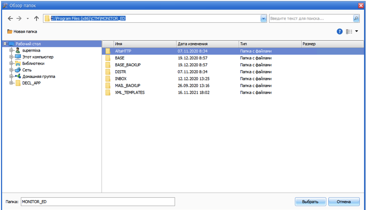 5. В появившемся диалоге обзора папок указать путь «C:\Program Files (x86)\CTM\MONITOR_ED» и нажать кнопку «Выбрать».