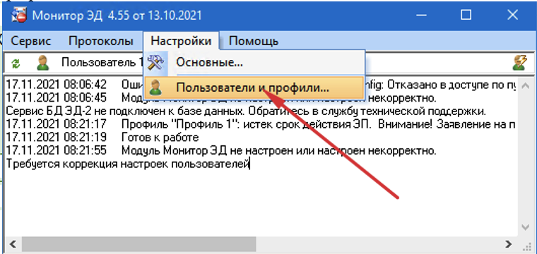 3. В появившемся окне «Монитор ЭД» зайти в меню Настройка->Пользователи и профили…