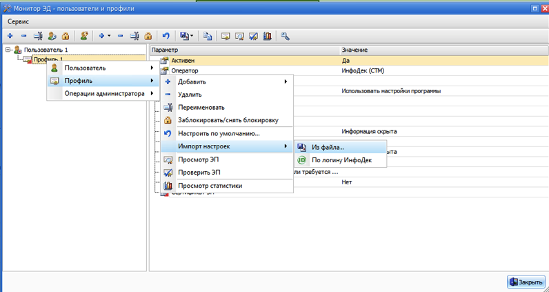 4. В появившемся окне «Монитор ЭД-пользователи и профили» правой кнопкой мыши нажать на «Профиль 1» и в появившемся окне выбрать Профиль->Импорт настроек->Из файла…