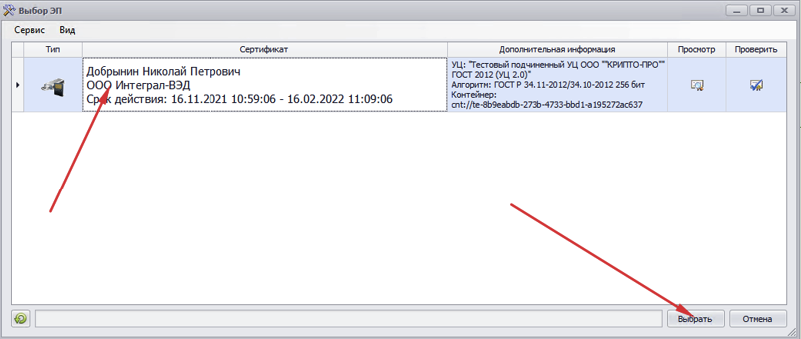 7. Два раза щелкнуть на строке «Сертификат ЭП» и в появившемся диалоге выбрать электронную подпись.