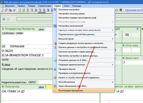 2. Зайти в меню Сервис->Регистрация программы