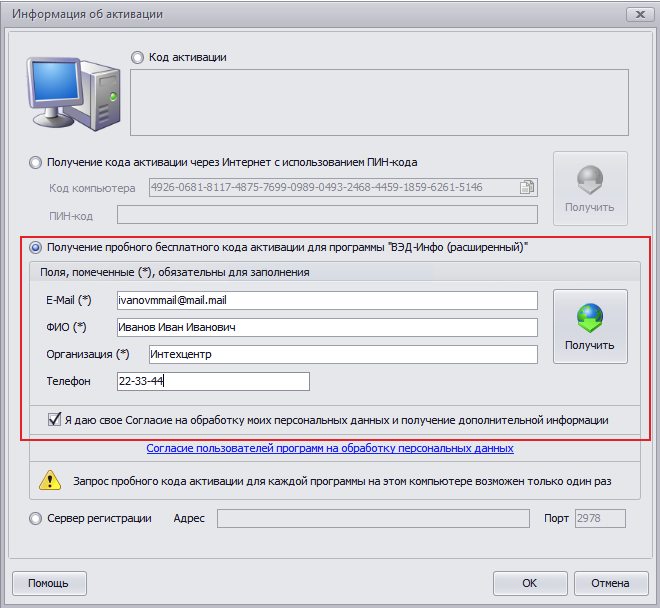 3. В появившемся окне регистрации выбрать пункт выбрать пункт «Сервер регистрации». Установить переключатель “Получение пробного бесплатного кода активации для программы…”. Заполнить необходимые для получения регистрации поля (E-Mail, контактное лицо и название организации) и отметить переключатель «Я даю сове Согласие на обработку моих персональных данных и получение дополнительной информации».