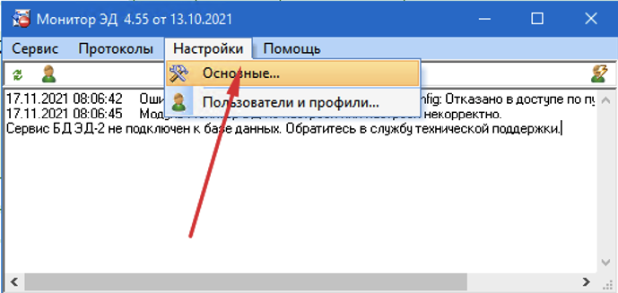3. В появившемся окне «Монитор ЭД» зайти в меню Настройка->Основные