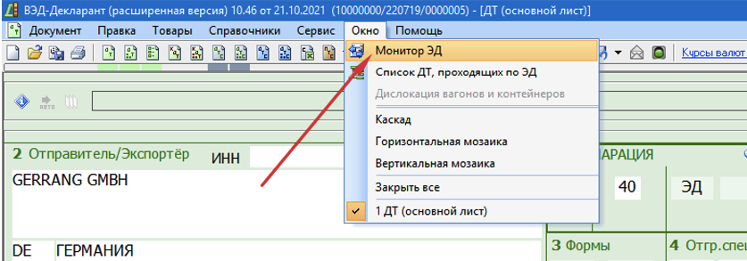 1. Запустить программу ВЭД-Декларант. 2. Зайти в меню Окно->Монитор ЭД