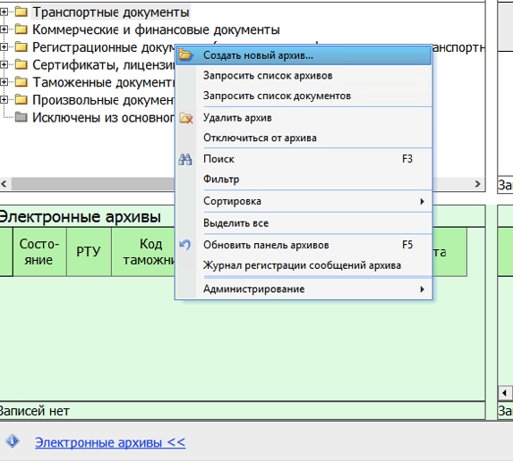 3. В появившейся таблице электронных архивов нажать правой кнопкой и выбрать «Создать новый архив»
